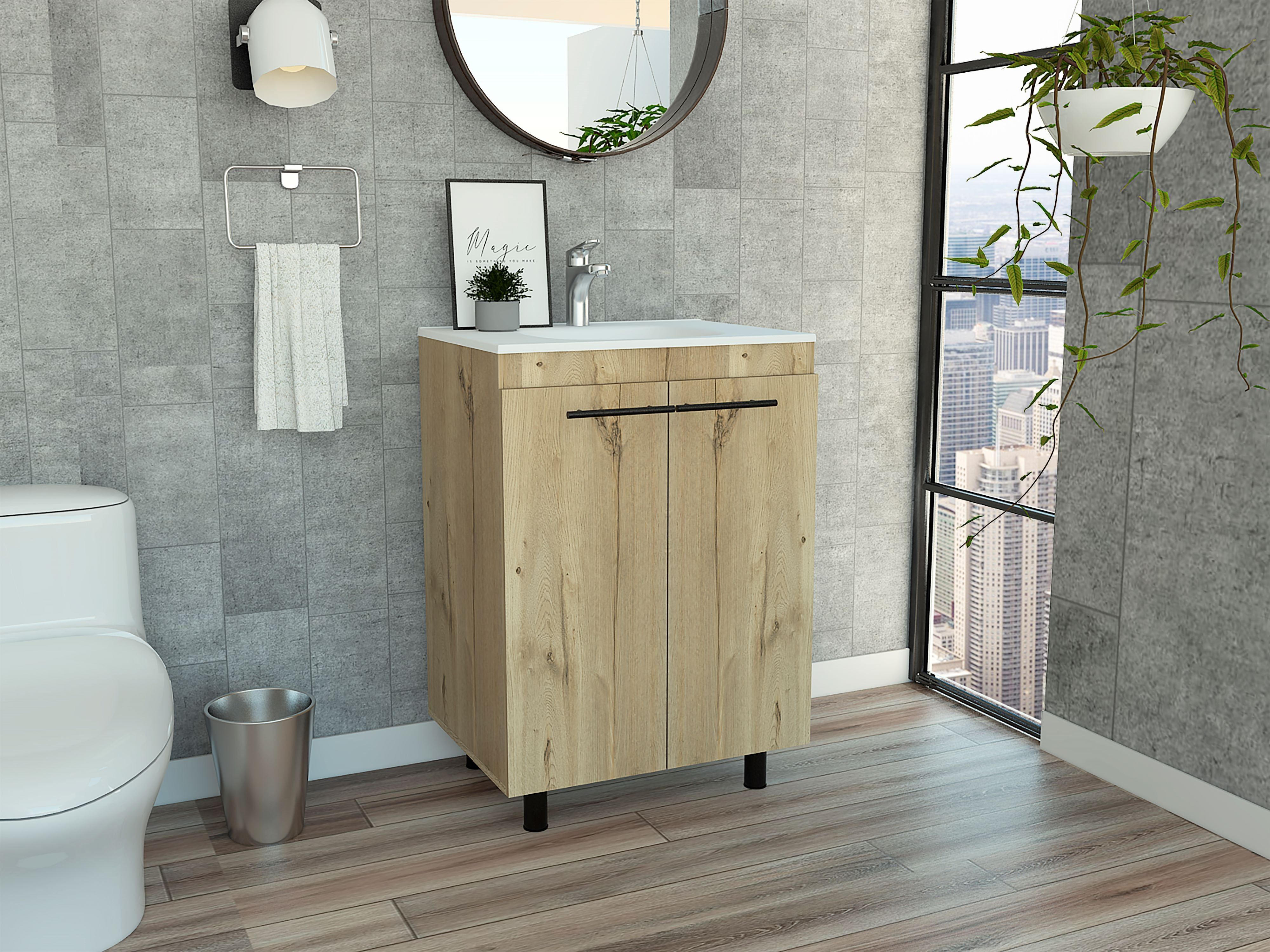 The FM Selma 60" Single Freestanding bathroom vanity is one of a kind. Its minimal and stylish design makes it so attractive for the public; also the size; it can fit almost everywhere. This model comes with a durable pure white reinforced resin superior-top and features two doors; all-metal hardware for a reliable and lasting product; adjustable legs for a better fitting of your space; and a One hole sink. The cabinet with a depth of 18.1 Inches and standing at 34.1 Inches high will allow you plenty of room to connect the pipes and have plenty of storage space. This product is the perfect solution for narrow space bathrooms where the 23.8 In width comes as a critical feature by giving you a fantastic top design product and still providing you with plenty of room in your bathroom. **FAUCET NOT INCLUDED**. Light Oak Finish